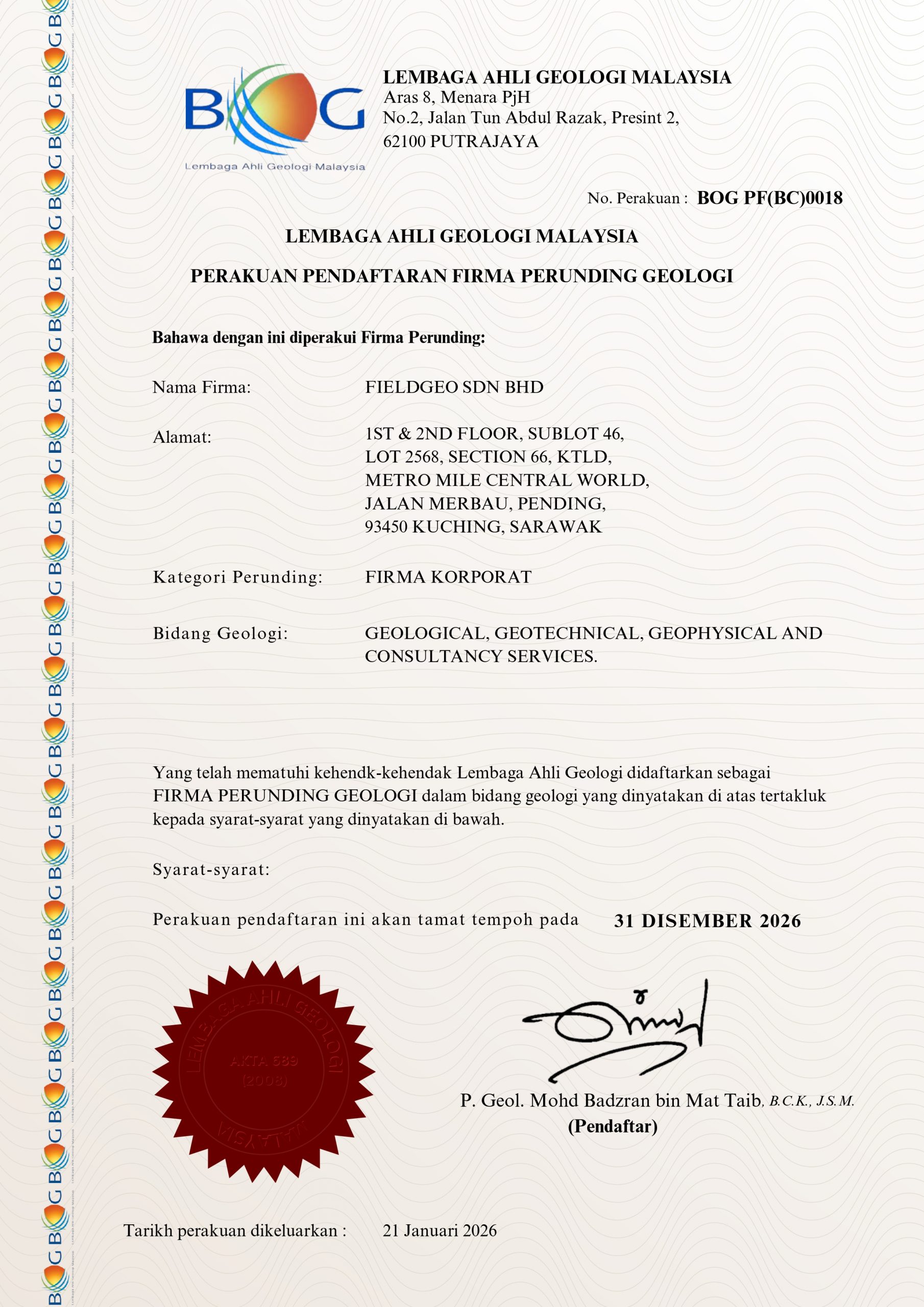 Originally founded as a provider of drilling services in geotechnical engineering, civil works, groundwater, and hydrogeological engineering in Sarawak, Fieldgeo Sdn Bhd has evolved into a specialized company offering high-quality Geo-Sciences and Geo-engineering data services in Malaysia. With a team of qualified and experienced personnel across various specializations, we possess the capability to deliver a comprehensive range of ground investigations, laboratory services, construction works, as well as supplies and maintenance for both construction and laboratories.